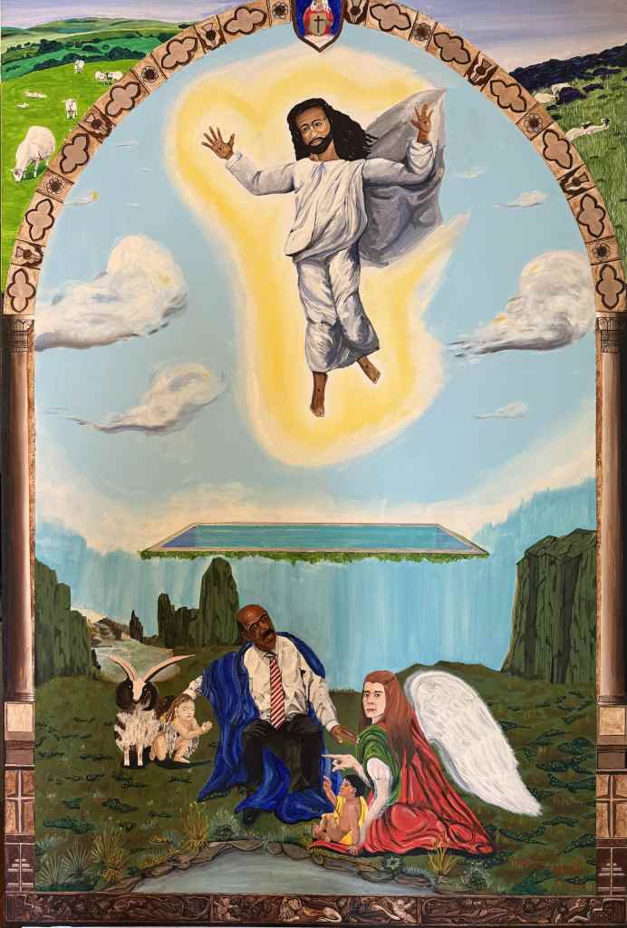 The People’s Altarpiece, 40 x 60. A years work of research and months of work on the canvas. It is my belief that most likely Adam and Eve were dark toned, in God’s image means in God’s perfection. The manger for the young couple of Mary and Joseph was more likely with no wood, all stone, which is more the case in Bethlehem. The place where our savior laid his head was more likely blankets on stone, the feeding place of livestock. The altarpiece shows the holy trinity, the fore coming of our savior is seen in the piece. The baptismal urn the fish, the lilies representing his life. Adam stands with the rock and sling of David and the crook of the good shepherd. Mary looks up to the heaven and has a spiritual connection to her Lord while having the foreshadowing of births to come. The Hebrew titles of them both are seen painted into wood, forever to be there but also capable of fading away.